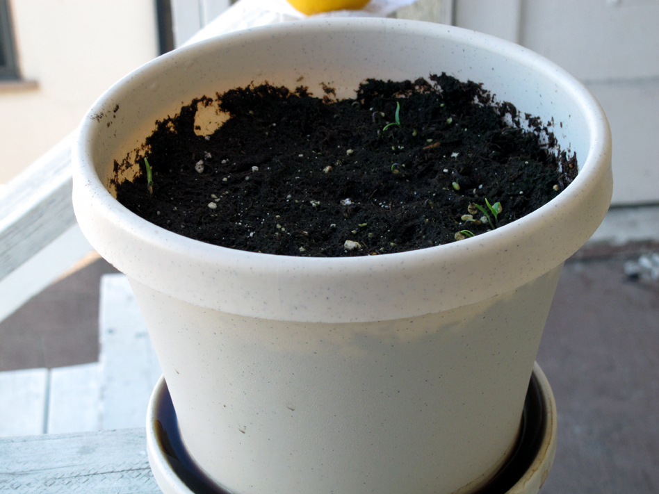 Twenty minutes later, the leftovers were sprinkled in a pot full of Miracle Gro Seed Starting Soil. After twelve days of basic maintenance and sunlight, the greenhouse looked familiar somehow: