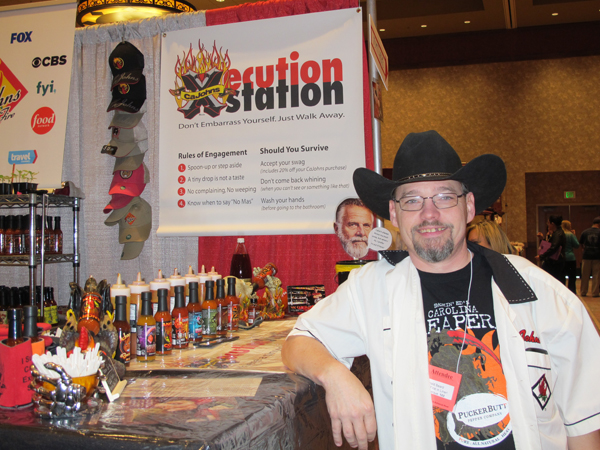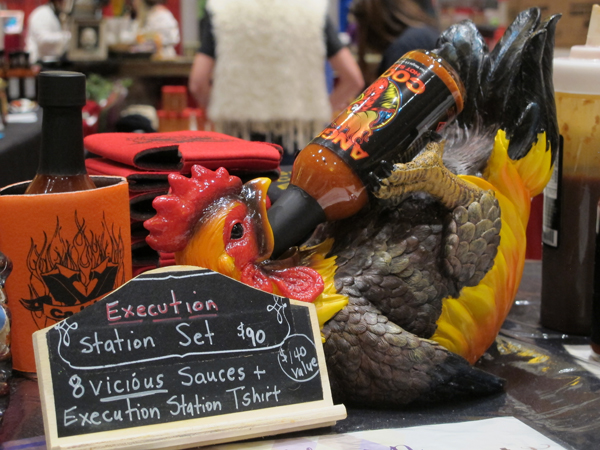 Hans was kind enough to suggest that I take the Execution Station challenge while he recorded the horrible soul-crushing ordeal experience. For those of you just joining us this year, the Execution Station is a little pocket of hell that Vic and CaJohn use to punish the wicked and foolish. Not with imps and pitchforks. At least, not since the imps unionized a few years back. Instead, the guys use eight special blends of chiles, torment, and vengeance to punish the hubris of anyone who thinks they can handle superhots on steroids. Vic offers you a spoon with the first sauce. If your mouth survives that, you have the privilege of inflicting more pain on it with successively hotter and hotter sauces until you go fetal or finish the eighth and final sauce (which, as I found out, had a 6 million SHU extract floating in the top of it). Get through all eight and you get a sticker and a drink cozy that proclaims your victory over the Execution Station. I agreed. If I hadn’t you wouldn’t be reading this.